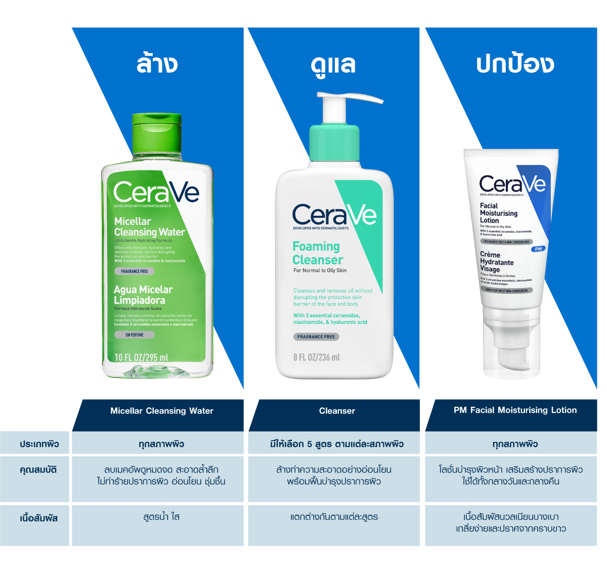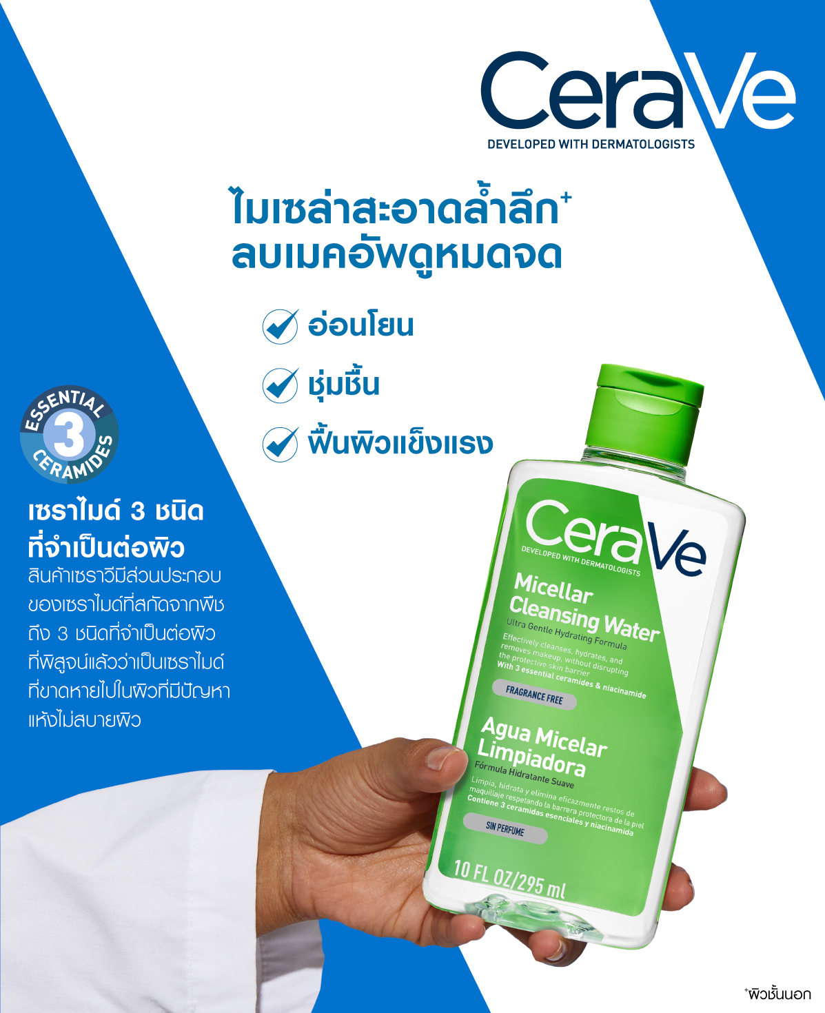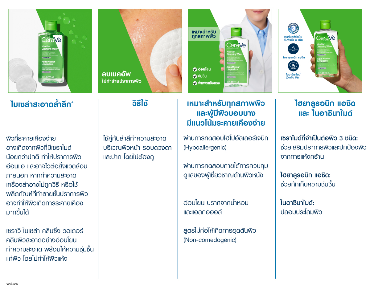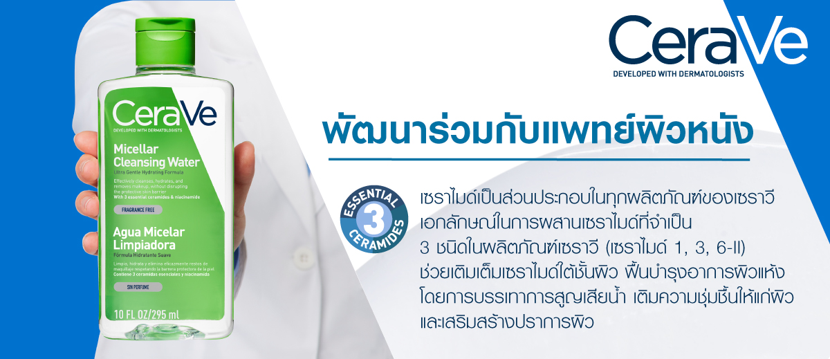 • รายละเอียดผลิตภัณฑ์ / PRODUCT DESCRIPTIONเซราวี CERAVE Micellar Cleansing Water ไมเซล่า คลีนซิ่ง วอเตอร์ ลบทุกเมคอัพ ทุกสภาพผิวเซราวี CERAVE Micellar Cleansing Water ไมเซล่า คลีนซิ่ง วอเตอร์ ลบทุกเมคอัพ ทุกสภาพผิว • เหตุผลที่คุณจะหลงรัก / WHY YOU WILL LOVE ITลบเมคอัพไม่ทําร้ายปราการผิวลบเมคอัพไม่ทําร้ายปราการผิว • ผลลัพธ์ที่รู้สึกได้ / RESULTSเหมาะกับทุกสภาพผิวเเละผู้มีเเนวโน้มระคายเคืองง่าย ผ่านการทดสอบไฮโปอัลเลอร์เจนิก ผ่านการทดสอบภายใต้การควบคุมดูเเลของผู้เชี่ยวชาญด้านผิวหนัง อ่อนโยน ปราศจากนํ้าหอม เเละเเอลกอฮอล์ สูตรไม่ก่อให้เกิดการอุดตันผิว (Non-comedogenic)เหมาะกับทุกสภาพผิวเเละผู้มีเเนวโน้มระคายเคืองง่าย ผ่านการทดสอบไฮโปอัลเลอร์เจนิก ผ่านการทดสอบภายใต้การควบคุมดูเเลของผู้เชี่ยวชาญด้านผิวหนัง อ่อนโยน ปราศจากนํ้าหอม เเละเเอลกอฮอล์ สูตรไม่ก่อให้เกิดการอุดตันผิว (Non-comedogenic) • วิธีใช้ / HOW TOใช้คู่กับสําลีทําความสะอาดบริเวณผิวหน้า รอบดวงตาเเละปาก โดยไม่ต้องถูใช้คู่กับสําลีทําความสะอาดบริเวณผิวหน้า รอบดวงตาเเละปาก โดยไม่ต้องถู • แบรนด์ของเรา / ABOUT OUR BRANDเรื่องราวของ CeraVe เริ่มต้นขึ้นในปี 2548 หลังจากผู้เชี่ยวชาญสังเกตว่าสภาพผิวหลายอย่างเช่น สิว กลาก โรคสะเกิดเงินและหิวแห้ง ล้วนมีสิ่งหนึ่งที่เหมือนกัน นั่นคือเกราะปกป้องผิวหนังถูกทำลาย CeraVe จึงได้รับการพัฒนาร่วมกับแพทย์ผิวหนังผู้เชี่ยวชาญและออกผลิตภัณฑ์ดูแลผิวที่มีเซราไมด์ที่จำเป็นต่อผิว 3 ชนิด เพื่อช่วยฟื้นฟู และช่วยเสริมเกราะปกป้องผิวให้กลับมาแข็งแรง สุขภาพดีThe CeraVe story began in 2005 After experts noticed that many skin conditions such as acne, eczema, psoriasis and dry skin all had one thing in common: a compromised skin barrier. Developed with dermatologists, CeraVe offers a complete line of skincare products that contain three essential ceramides enhanced with a revolutionary delivery system to help restore the skin’s natural protective barrier. ลบเมคอัพ • รายละเอียดผลิตภัณฑ์ / PRODUCT DESCRIPTIONเซราวี CERAVE Micellar Cleansing Water ไมเซล่า คลีนซิ่ง วอเตอร์ ลบทุกเมคอัพ ทุกสภาพผิวเซราวี CERAVE Micellar Cleansing Water ไมเซล่า คลีนซิ่ง วอเตอร์ ลบทุกเมคอัพ ทุกสภาพผิว • เหตุผลที่คุณจะหลงรัก / WHY YOU WILL LOVE ITลบเมคอัพไม่ทําร้ายปราการผิวลบเมคอัพไม่ทําร้ายปราการผิว • ผลลัพธ์ที่รู้สึกได้ / RESULTSเหมาะกับทุกสภาพผิวเเละผู้มีเเนวโน้มระคายเคืองง่าย ผ่านการทดสอบไฮโปอัลเลอร์เจนิก ผ่านการทดสอบภายใต้การควบคุมดูเเลของผู้เชี่ยวชาญด้านผิวหนัง อ่อนโยน ปราศจากนํ้าหอม เเละเเอลกอฮอล์ สูตรไม่ก่อให้เกิดการอุดตันผิว (Non-comedogenic)เหมาะกับทุกสภาพผิวเเละผู้มีเเนวโน้มระคายเคืองง่าย ผ่านการทดสอบไฮโปอัลเลอร์เจนิก ผ่านการทดสอบภายใต้การควบคุมดูเเลของผู้เชี่ยวชาญด้านผิวหนัง อ่อนโยน ปราศจากนํ้าหอม เเละเเอลกอฮอล์ สูตรไม่ก่อให้เกิดการอุดตันผิว (Non-comedogenic) 